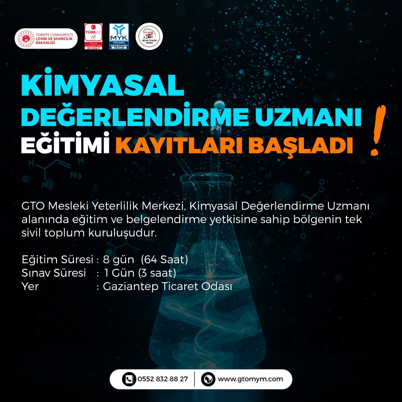 Siz de Kimyasal Değerlendirme Uzmanı belgesine sahip olabilmek için GTO MYM tarafından 13 Ekim 2025 – 20 Ekim 2025 tarihleri arasında düzenlenecek sınırlı kontenjanlı eğitime başvurabilirsiniz.