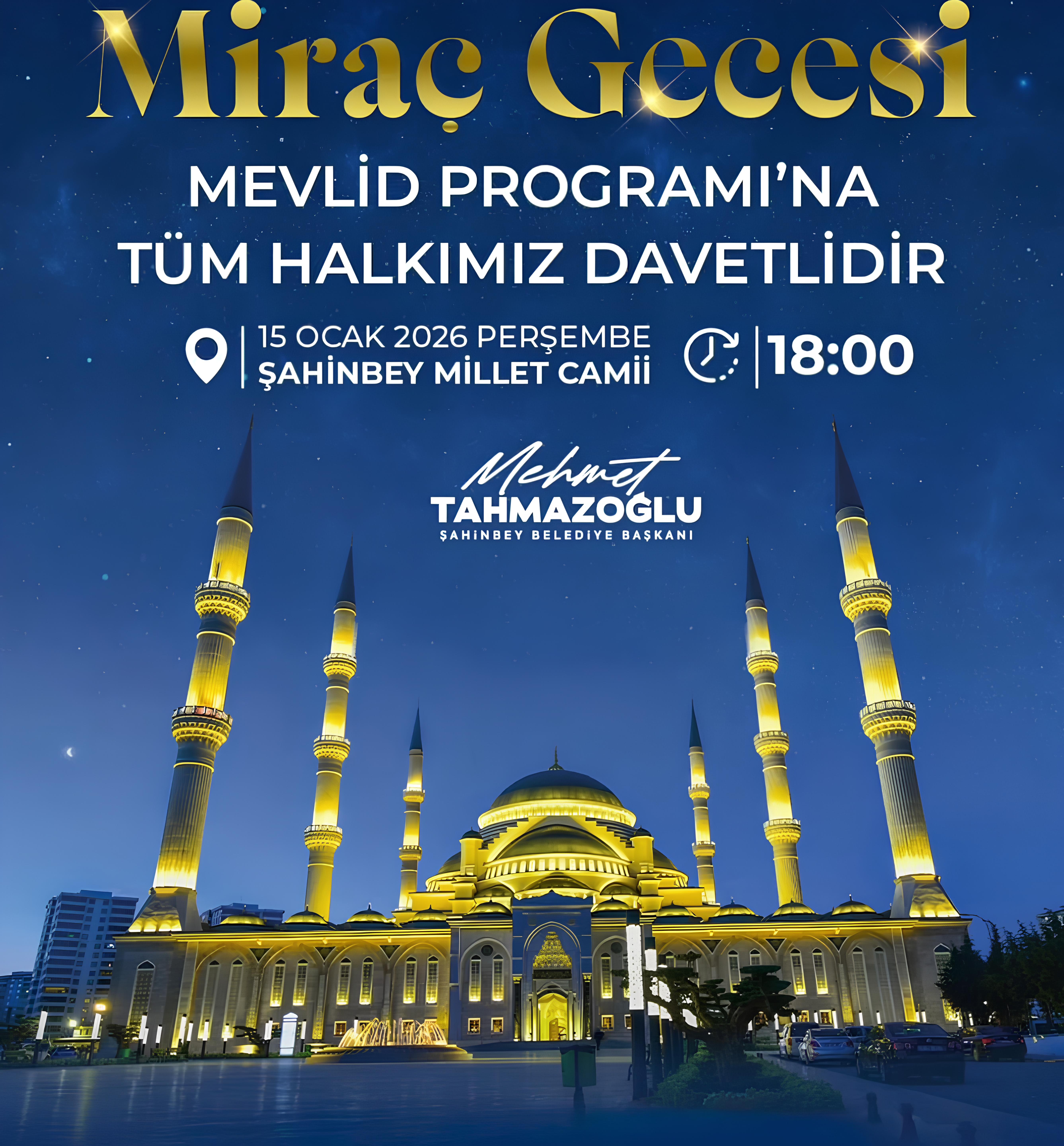 Miraç Gecesinin manevi iklimini birlikte idrak etmek için Şahinbey Millet Camiinde buluşuyoruz.