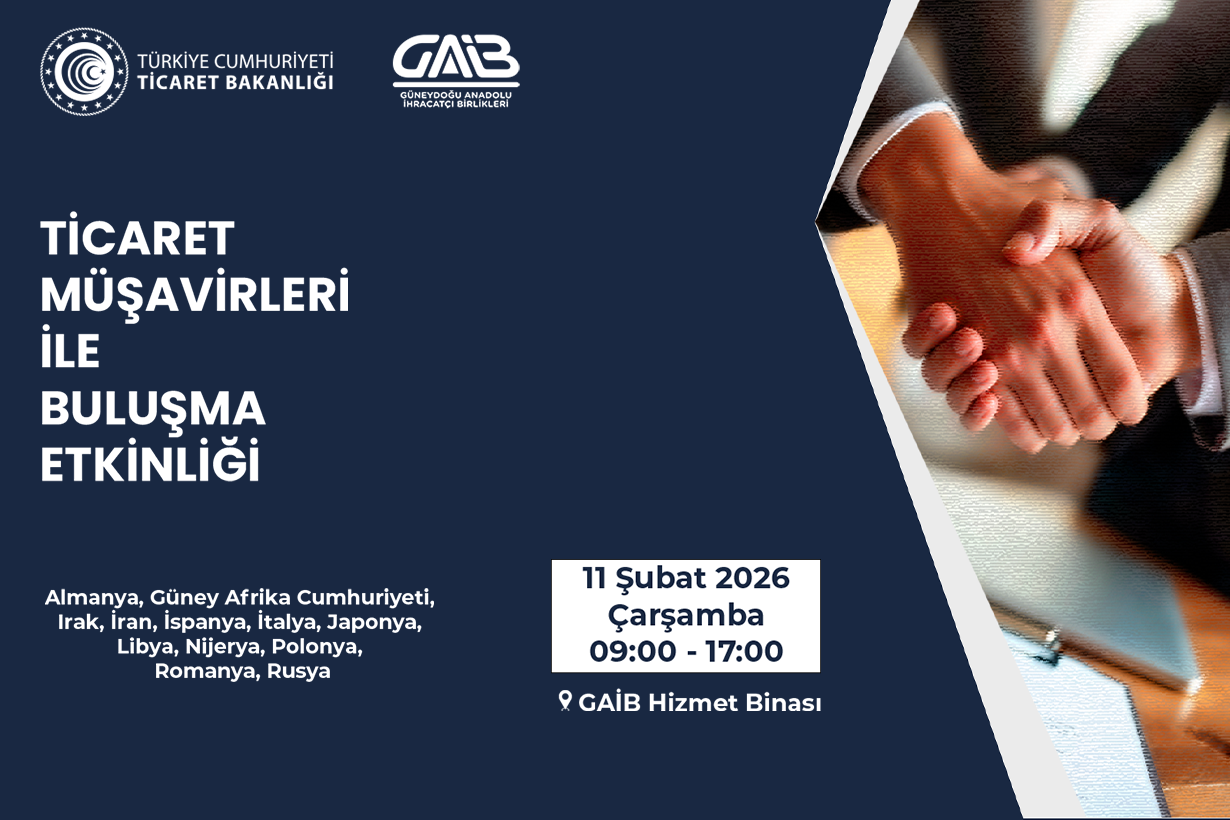 Daha önce Almanya, Güney Afrika Cumhuriyeti, Irak, İran, İspanya, İtalya, Japonya, Libya, Nijerya, Polonya, Romanya, Rusya’da görev yapan Ticaret Müşavirleri/Ataşeleri ile 11 Şubat 2026 Çarşamba günü saat 09:00-17:00 saatlerinde GAİB Hizmet Binası’nda birebir görüşmeler(B2B) gerçekleştirilecektir.