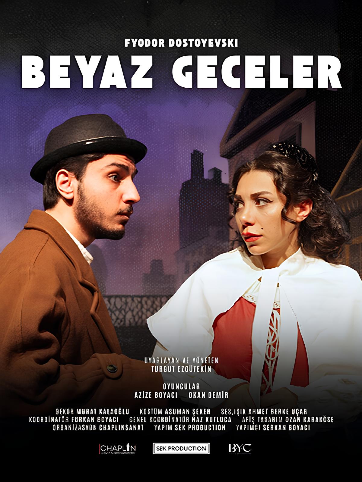 Beyaz Geceler, yalnızlığın şiirdir. Petersburg; un kalabalığı içindeki yalnızlığını hayallerinde avutmaya çalışan bir gençle, şehrin kenar mahallelerinde köhne bir eve sıkışıp kalmış bir genç kızın farkına varamadığı yalnızlığının kesiştiği noktada Dostoyevski; nin gençlik coşkusuyla yazdığı bir şiir. Oyunumuzun kahramanı gençle, genç kızımız Nastenka; nın, yüreklerini ilk kez başka birine açmayı deneyimledikleri Petesburg köprüsü 4 gecelik bir aşk öyküsüne sahne olur.